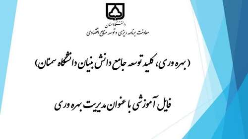 معاونت برنامه‌ریزی و توسعه منابع اقتصادی دانشگاه، پیرو مصوبات اولین جلسه شورای بهره‌وری دانشگاه سمنان با تاکید بر شعار “بهره‌وری، کلید توسعه جامع دانش بنیان دانشگاه سمنان” اقدام به تهیه فایل آموزشی با عنوان "مدیریت بهره‌وری" نموده است. به همین منظور فایل آموزشی پیوست با هدف آشنایی یاوران محترم علمی با مفاهیم و مبانی بهره‌وری و همچنین استقرار چرخه بهره‌وری در دانشگاه سمنان جهت استحضار و بهره برداری لازم تقدیم حضور می‌گردد. لازم به ذکر است آزمونی از مطالب ارائه شده در اردیبهشت ماه برگزار خواهد شد که جزئیات آن متعاقباً اطلاع‌رسانی خواهد شد. همچنین به اطلاع می‌رساند کاربرگ نظام پیشنهادات بهره‌ورانه و سایر کاربرگ‌های مربوطه نیز به منظور پیاده‌سازی نظام مسائل در دانشگاه سمنان در هفته‌های آتی از طرف این معاونت ارسال می‌گردد که با توجه به هماهنگی‌های صورت گرفته با ریاست محترم دانشگاه به برگزیدگان مسابقه و تکمیل بهترین کاربرگ جوایزی تعلق خواهد گرفت.