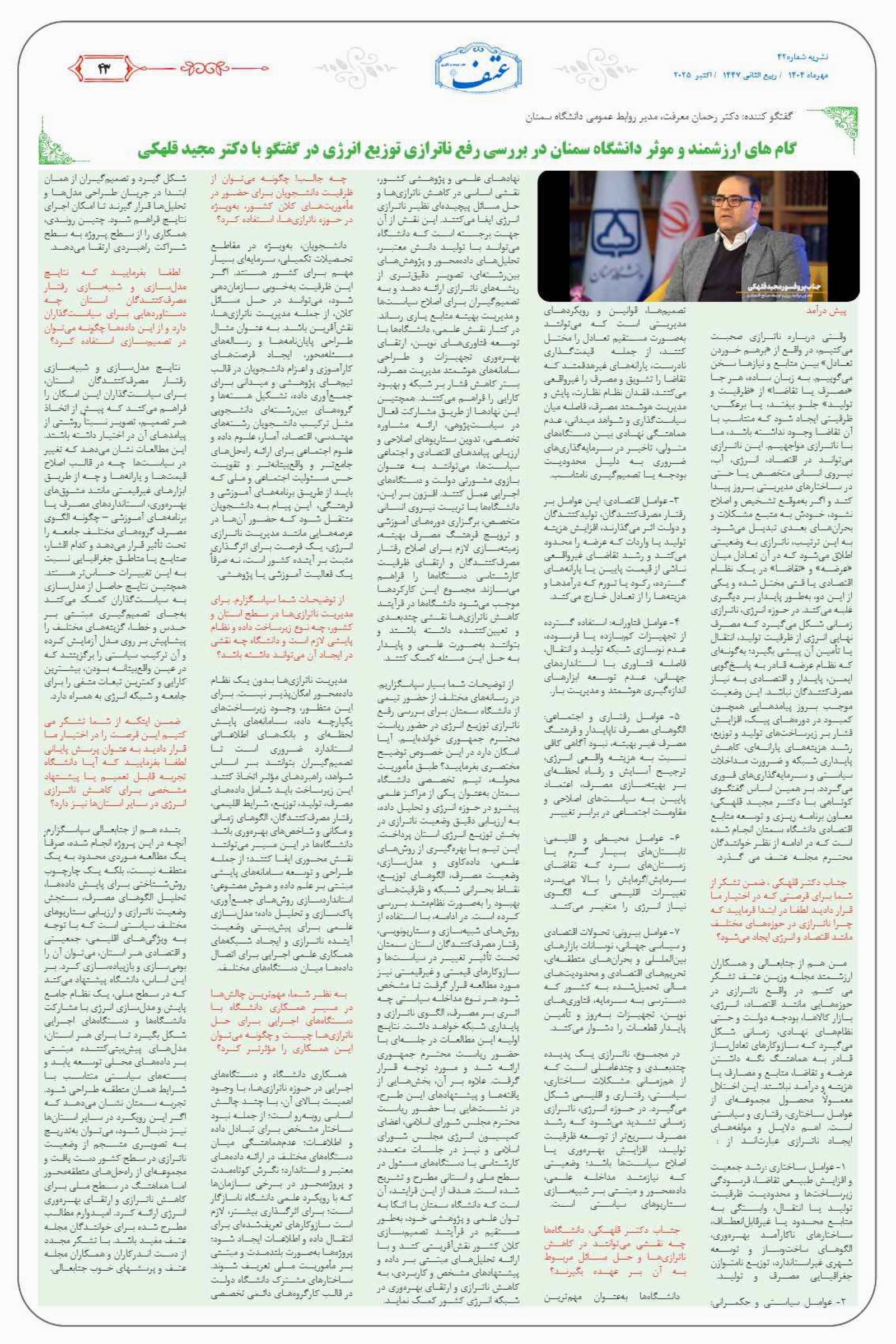 انعکاس گفتگوی مدیر روابط عمومی دانشگاه سمنان با دکتر مجید قلهکی معاونت برنامه ریزی و توسعه منابع اقتصادی این دانشگاه درباره گام های دانشگاه سمنان در بررسی رفع ناترازی توزیع انرژی در نشریه عتف وزارت علوم