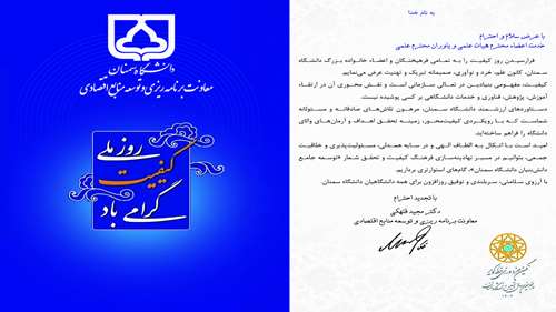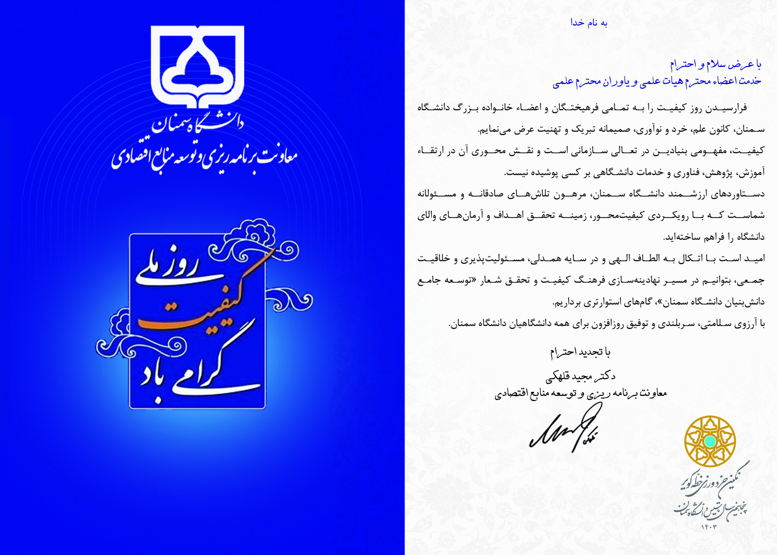 پیام تبریک معاون محترم برنامه ریزی و توسعه منابع اقتصادی به مناسبت ۱۸ آبان روز ملی کیفیت 1404/08/17 - 19:05 تعداد بازدید: 27 کلمات کلیدی